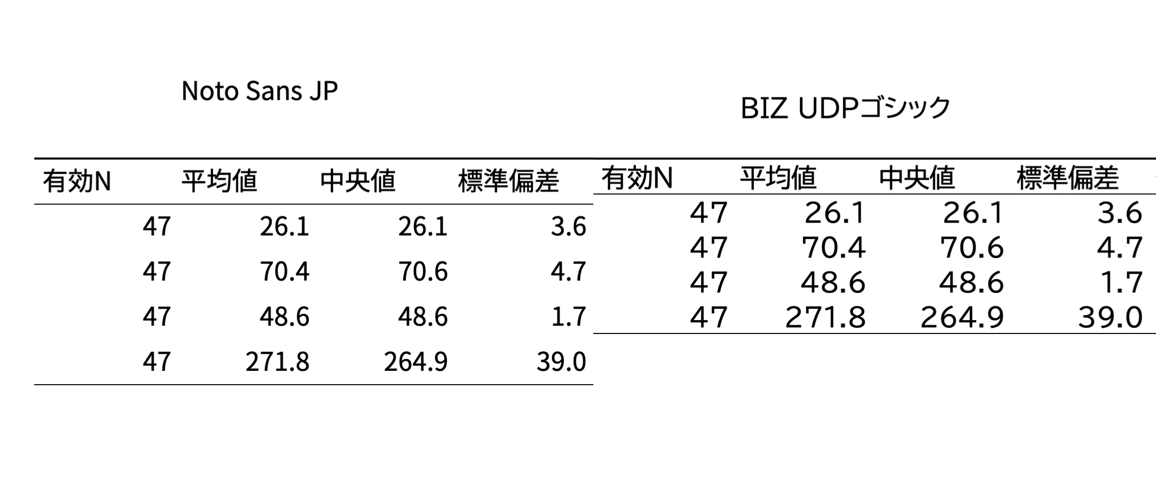 BIZ UD"P"ゴシックの数字はほぼ等幅だが、1のグリフのみ幅が細い。BIZ UDゴシックは全ての数字が等幅だが幅が日本語の1/2と狭い:読みやすい「BIZ UD」を帳票向けにカスタマイズした「帳票 UDPゴシック」フォントが公開 - 窓の杜 ↩ -