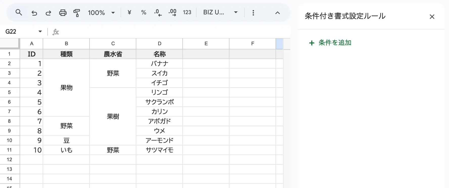 スプレッドシートにおいて隣り合ったセルが同じテキストであるような場合に、セル結合を使わずに、条件付き書式を用いて視覚的にグルーピングする方法を紹介します。