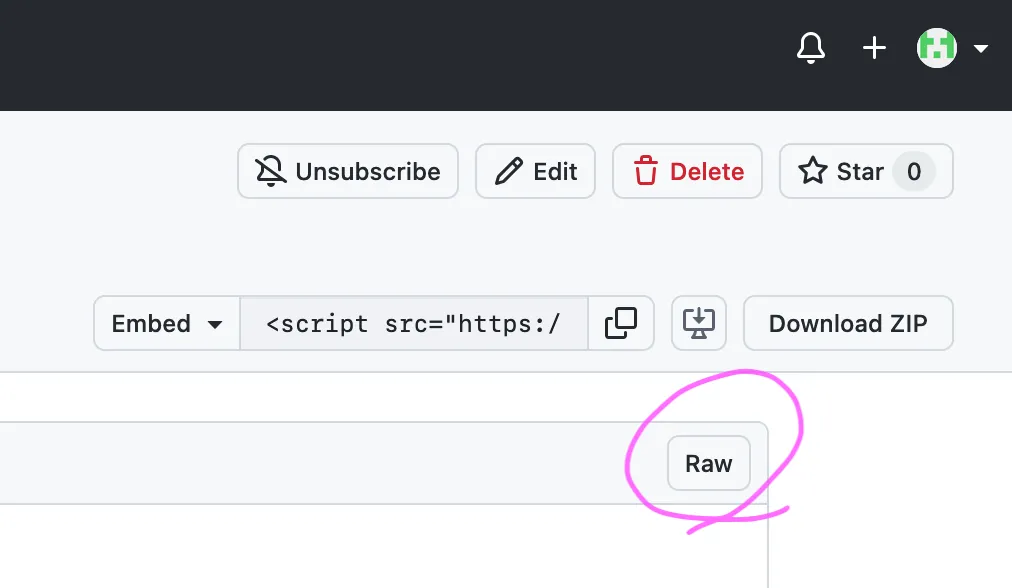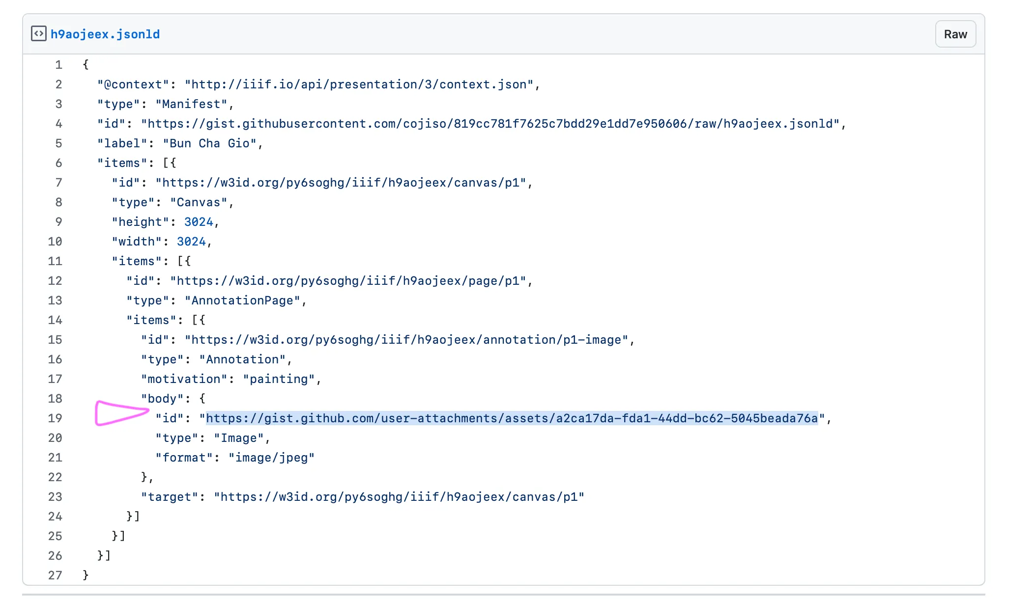 { "@context": "http://iiif.io/api/presentation/3/context.json", "type": "Manifest", "id": "https://gist.githubusercontent.com/cojiso/819cc781f7625c7bdd29e1dd7e950606/raw/h9aojeex.jsonld", "label": "Bun Cha Gio", "items": [{ "id": "https://w3id.org/py6soghg/iiif/h9aojeex/canvas/p1", "type": "Canvas", "height": 3024, "width": 3024, "items": [{ "id": "https://w3id.org/py6soghg/iiif/h9aojeex/page/p1", "type": "AnnotationPage", "items": [{ "id": "https://w3id.org/py6soghg/iiif/h9aojeex/annotation/p1-image", "type": "Annotation", "motivation": "painting", "body": { "id": "https://gist.github.com/user-attachments/assets/a2ca17da-fda1-44dd-bc62-5045beada76a", "type": "Image", "format": "image/jpeg" }, "target": "https://w3id.org/py6soghg/iiif/h9aojeex/canvas/p1" }] }] }]}- 以下の画像で示す位置にあるURLを、手順1-4 で控えたURLに書き換えます